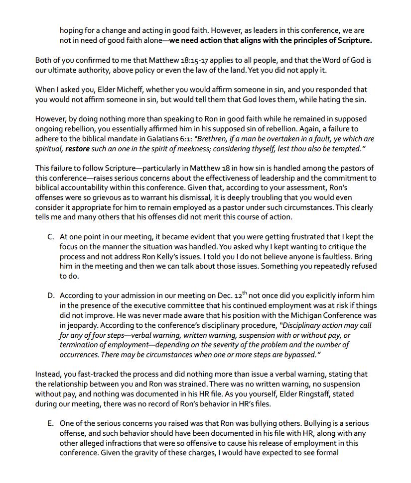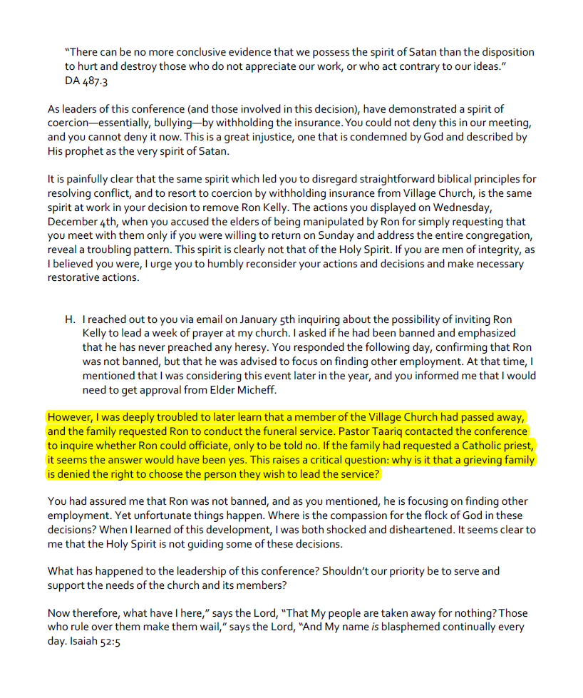 Pastor Page wrote a letter yesterday to Jim Micheff, Justin Ringstaff, and the Michigan Conference Executive Committee. Here is the letter, which includes a timeline and a very grievous move on the part of the Michigan Conference. Apparently, a family just asked Ron Kelly to conduct a funeral at the Village Church for a member who passed away. The Michigan Conference said ‘No.’
