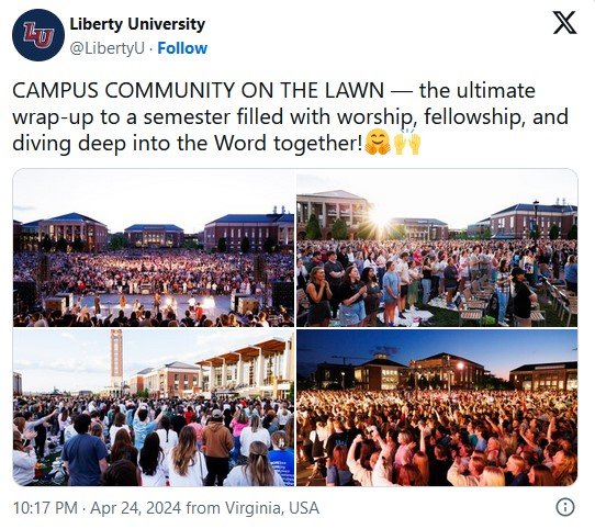 “There is no greater joy than seeing God's people delight in His truth,” a Liberty University spokesperson told Fox. “While we are all tragically witnessing the state of college campuses . . . speaking with the language of hatred and promoting a wicked ideology that favors the annihilation of an entire race of people, by contrast, thousands of Liberty students gathered last night on our academic lawn for the worship of the Lord Jesus Christ, Scripture reading, preaching, and prayer. Liberty students are actively seeking the presence of God,” they added.